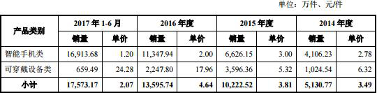 精研科技2014年至2017年1-6月可穿戴设备类产品销售单价分别为6.32元/件、5.32元/件、17.96元/件、24.28元/件;销量分别为1,024.54万件、3,596.36万件、2,247.80万件、659.49万件。