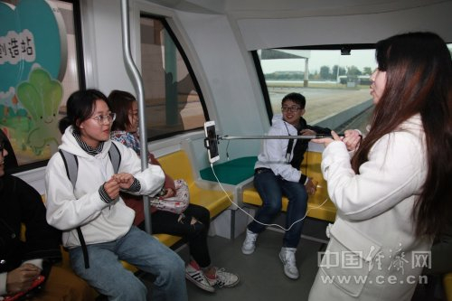 正在进行网络直播的“食安小网红”在列车上采访同学