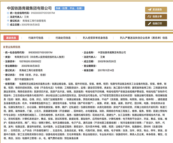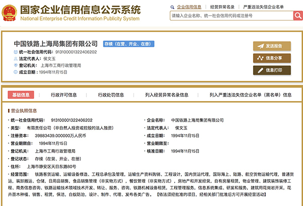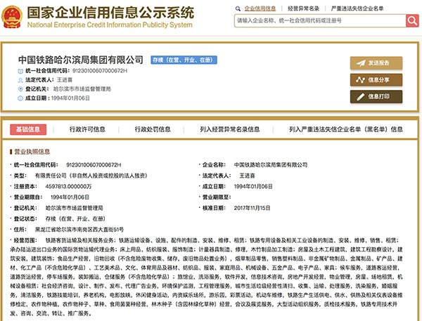 11月16日,澎湃新闻(www.thepaper.cn)记者查询发现,在国家企业信用信息公示系统中,又有3家铁路局(公司)——中国铁路哈尔滨局集团有限公司、中国铁路青藏集团有限公司、中国铁路上海局集团有限公司,已经完成工商登记变更。