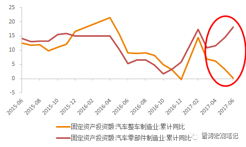 一辆新能源汽车的整车制造成本只占28%,而零部件成本占到72%;相比之下,一辆燃油汽车的零件成本只占50%左右。新能源车的技术核心是“三电”(电驱动、电池、电控)等零件而非整车。当2017年新能源汽车销售走高后,汽车零部件和整车制造的固定资产投资出现背离。汽车零配件固定资产投资迅速增长,从3月的10.9%上升至6月的18.3%,而整车固定资产投资降至0。