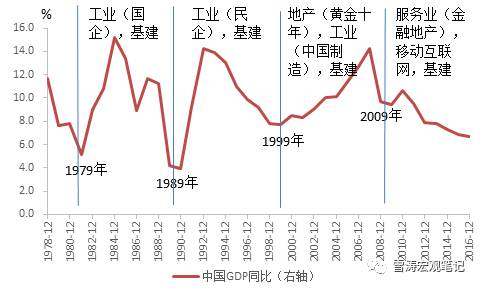 回顾中国改革开放至今的38年,每个朱格拉周期也对应了不同的主导产业: