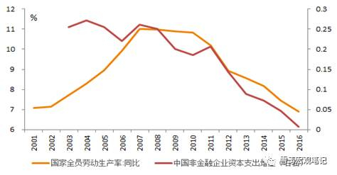 图2:中国劳动生产率 VS 非金融企业资本支出增速:5年移动平均