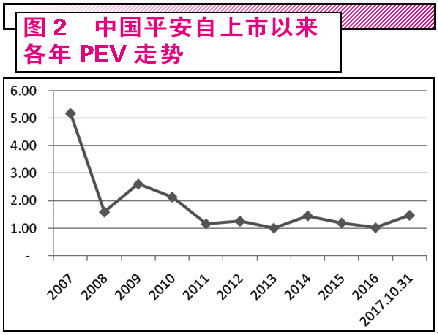 图2是中国平安自上市以来各年PEV的变化。中国平安上市以来各年PEV平均值是1.82,从上图可以看出,除了刚上市前三年之外,其余年份的PEV值始终在1至2的区间内波动。按照2017年内含价值预计金额8000亿元(其中寿险业务EV预计5000亿元)测算,截至2017年10月31日,中国平安的PEV值仅为1.47。而海外保险业巨头友邦保险PEV多年一直维持在2.0左右。因此笔者认为,一旦投资者理解了中国平安综合金融模式、“金融+科技双驱动”所具备的优势后,中国平安PEV维持在2.0左右将是今后的常态。