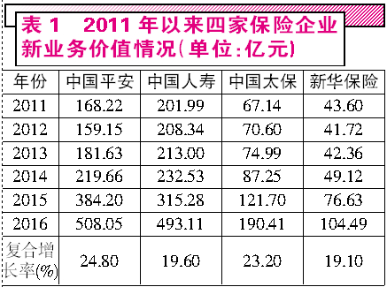 从表1可以看出,四家险企自2011年以来新业务价值均取得了较高的复合增长率,而中国平安六年来年新业务价值复合增长率最高,达24.8%。
