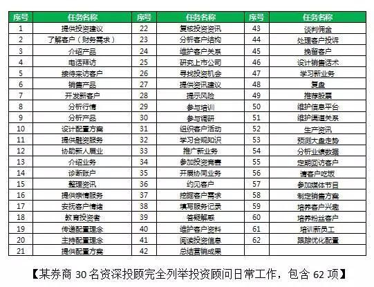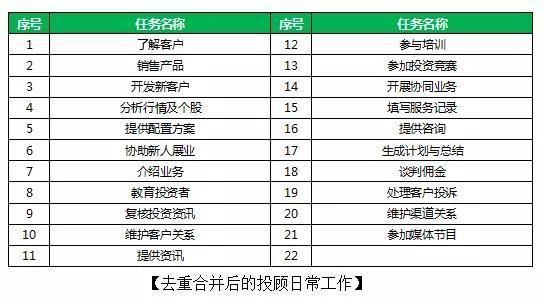遇到各类会议、合规自查、客户投诉处理、客户投资报告会时候,他还不得不停下手头的工作来处理这些紧急或者临时性的工作。根据统计,一个投顾的工作包含60多个任务(表一),把这些任务合并同类项、去除重复后仍有21项(表二)。