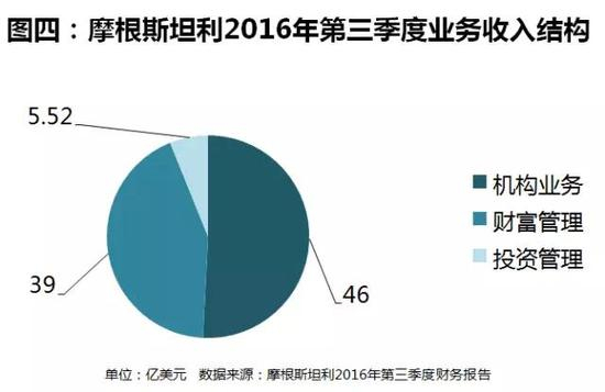 证券公司的这个产品代销收入,实质上是最接近狭义上财富管理这个概念的。当前在国际投行的业务规划中,都将基金、资管等理财产品销售纳入到了财富管理业务当中。美国主流机构的财富管理收入构成中产品代销收入是重要组成部分(如图四)。例如在2016年摩根斯坦利第三季度的财报中,财富管理业务带来了39亿美元的净利润,其中包含了资产管理费(含基金、资管产品销售)、交易费用、利息收入(包括两融利息收入和保证金利息收入)等。从收入结构的角度来看,摩根斯坦利将交易费用、利息收入、产品代销收入全部纳入到财富管理业务当中,所以其财富管理业务是包含了经纪业务的(如图五)。