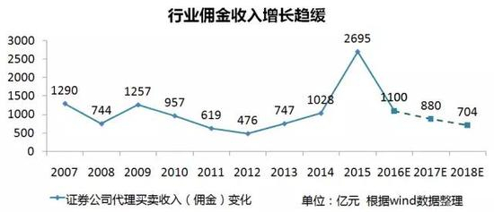 券商之间白热化的竞争、证券牌照的开放预期带来更多新的行业竞争对手,互联网金融企业的跨界竞争,种种迹象表明竞争只会加剧。根据中信证券的研究结果,券商经纪业务预计在2019年达到盈亏平衡点,将无法给证券公司带来净利润。而根据行业观察,华东某大型券商已经将佣金费率做到万分之二以下。所以我们推断未来三年,证券经纪业务的费率将会再下降一半。行业佣金收入2017将回到2013年的水平,2019年总体佣金收入可能仅仅只有500亿的规模,经纪业务的盈亏平衡点之后不是危言耸听。