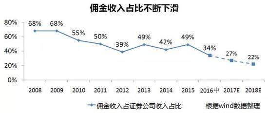 但经纪业务的沉沦却是毋庸讳言,佣金收入占比持续下降,由2008年的占比近七成下降到2016年仅占三成多一点。
