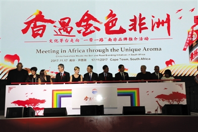 南非时间11月17日,茅台集团首次走进南非,并在开普敦国际会议中心举行“香遇金色非洲——文化茅台走向‘一带一路’”品牌推介会。会上,茅台集团首发了“贵州茅台走进非洲纪念酒”,并与华为、海信等10多家中资企业签署《非洲中国企业“一带一路”共同发展联盟倡议书》。