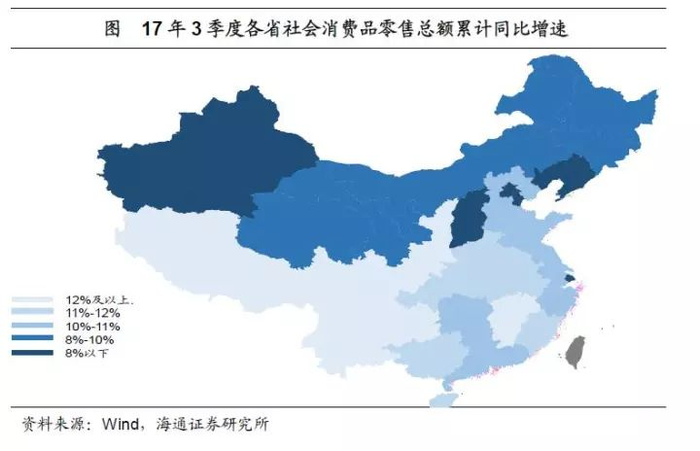 首先,我们从省份层面来观察消费增速及其变动趋势。从消费增速上看,中西部省份居前,东部次之,而东北省份垫底。17年3季度,东中西部省份社会消费品零售总额累计同比加权平均增速分别为9.9%、11.2%和11%,而同期东北省份增速只有5.3%,尚不到中部省份的一半。