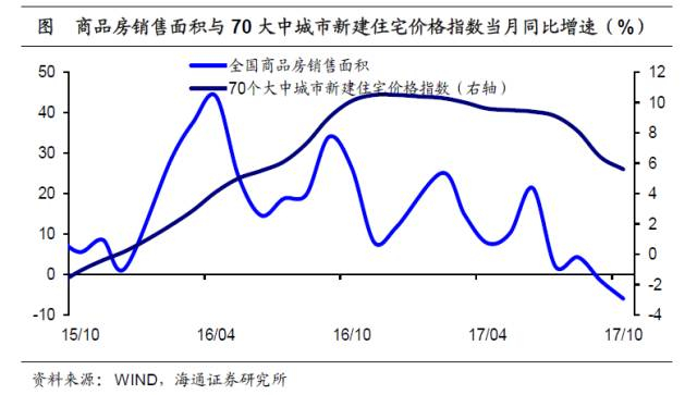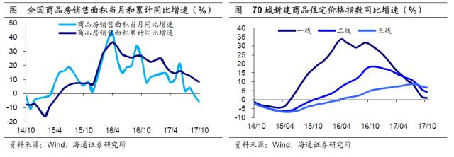 9月全国房地产销售面积首现负值,从8月的4.3%直接跌至-1.5%,10月更进一步深跌至-6%,同期房价指数也出现明显回落,70个大中城市新建住宅价格指数同比增速由8月的8.1%降至10月的5.6%,创16年7月以来新低,两者均指向房地产市场面临阶段性低迷。而受房价上涨带动的三四线城市高企的消费增速或面临回调,印证由地产带动的相关消费增速也在10月拐头向下。