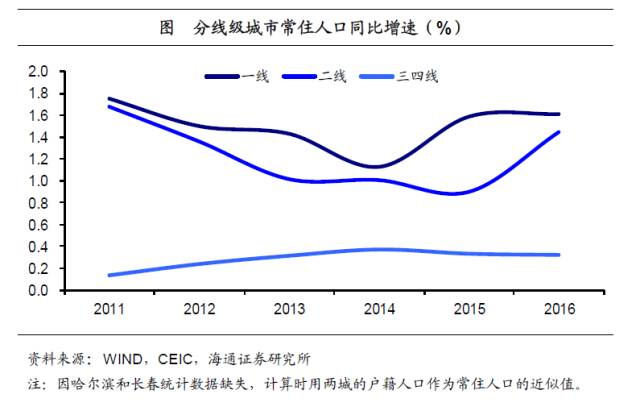 从常住人口规模增速上来看,一二线城市仍远高于三四线城市。16年一线城市常住人口同比增速1.61%,增长平稳;二线城市增速1.45%,保持了高速上涨势头;三线城市同比0.32%,增速走平且只有一线城市的20%左右。由此可见,三四线城市人口规模的低增速并不能解释其消费的高增长。
