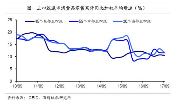 三四线消费走势分化。三四线城市数量较多,我们按照区域做了划分。我们发现,东部和中西部的三四线城市消费情况呈现明显的分化特征。从消费增速上看,17年3季度,中西部地区三四线城市比东部地区要高一个百分点以上。更明显地,从消费增速的变动趋势上看,东部省份三四线城市趋于平稳,其走势更接近于一二线城市,而中西部省份三四线城市消费增速变动更为剧烈。17年3季度,东部三四线城市消费品零售累计同比加权平均增速较16年下降0.5个百分点,而西部三四线城市上行0.6个百分点,中部三四线城市更是大幅上升2.2个百分点。