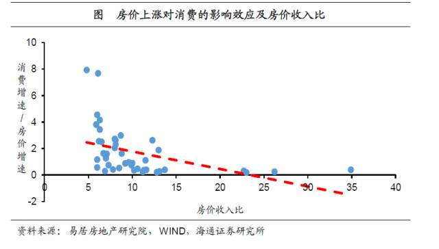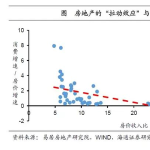 我们整理了包含一二三线的45个城市数据后发现,对于房价收入比较高的城市,房价上涨对消费的影响主要表现为“挤出效应”,比如北京(房价收入比为23),其房价上涨1%只会带来消费增速上涨0.2%,而对于房价收入比较低的城市,房价上涨对消费的影响则主要表现为“财富效应”,比如呼和浩特(房价收入比4.8).其房价上涨1%会带来7.9%的消费增速,根据我们的估算,房价上涨1%带来消费增速同步增长1%的房价收入比水平大概在9.2-9.5左右。