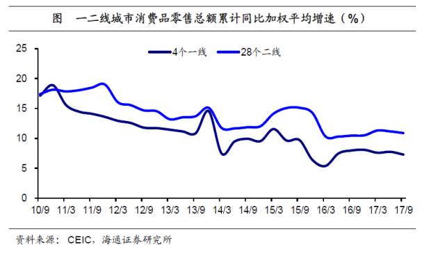 一二线消费总体平稳。二线城市消费增速普遍快于一线城市,从增速的变化上来看,17年3季度,一线城市消费品零售增速7.3%,较16年小幅下滑,二线城市增速10.9%,较16年略有回升。但一二线消费走势整体平稳,变化均不足一个百分点。