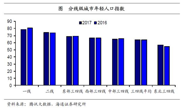 从人口结构上来看,三四线城市也并没有得到年轻人的青睐。根据腾讯大数据发布的全国城市年轻指数,年轻人口仍主要集中于一二线城市。2017年,一线城市平均年轻指数为78.5,二线城市为74.7,三四线城市均在70以下。三四线城市中,东部地区年轻指数最高,平均为68.8,西部地区居次为66.5,中部地区再次为65.2,东北地区排名垫底,只有56.8。因此,人口结构的改变可能部分解释了东北地区消费增速的滑落,但却无法解释三四线城市消费增速的高企。