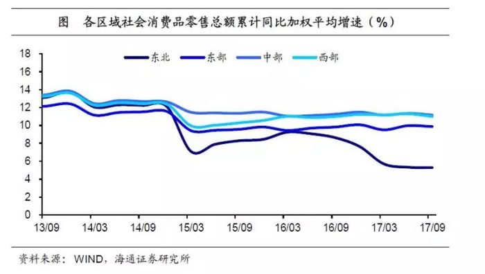 从过去几年消费增速走势看,东、中、西部省份均保持平稳,而东北地区下滑明显。17年3季度,东中西部省份社会消费品零售总额累计同比加权平均增速较16年分别下降0.2个百分点、0.3个百分点和0.2个百分点,而同期东北省份下滑2.3个百分点,降幅超过30%。