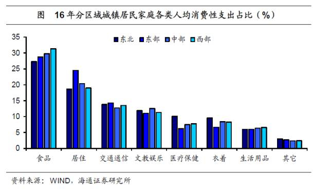 东北爱打扮,东部住房贵,中西部重温饱。我们以城镇居民人均消费支出为例来比较省份间的消费结构差异。从各类消费支出占比上看:东北省份偏爱打扮,16年东北地区居民衣着类支出占比高达9.5%,而东部地区仅6.7%,在同美容美发相关的其他用品及服务类支出中,东北同样排在第一;东部省份居住类支出占比过高,东部地区居民消费占比较高的领域是居住和文教娱乐,16年东部地区居民居住支出占比高达24.5%,而其他区域普遍在20%左右,差异显著;中西部省份食品支出仍占较大比重,16年西部、中部省份居民食品支出占比31.3%、29.8%,分别列第一、二位。