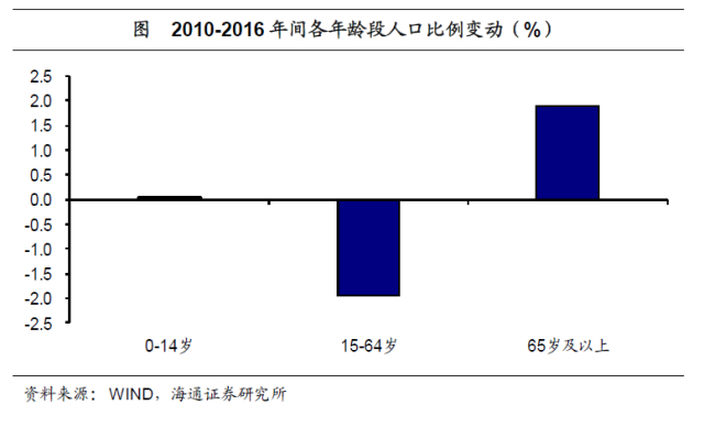 虽然人口并不是短期消费增速变动的主要原因,但长期消费趋势的判断需关注人口结构的变动。相较于2010年人口普查以来,16年人口结构呈现老龄化和低龄化趋势,中青年人口比例出现下降。相比于10年,16年65岁以上人口增加1.9个百分点,0-14岁人口增加0.04个百分点,而对应的15-64岁人口下降1.94个百分点。