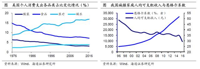 发达国家经验表明,随收入增加新兴消费比重将逐渐加大。目前在文教娱乐等消费上可支配收入较高的东部省份要明显快于中西部省份,十九大提出解决我国发展中的不平衡不充分问题,预示着区域经济发展将会更加协调,中西部与东部地区的收入差距有望缩小,而中西部地区收入水平的提高将有望带来新兴消费的进一步增长。