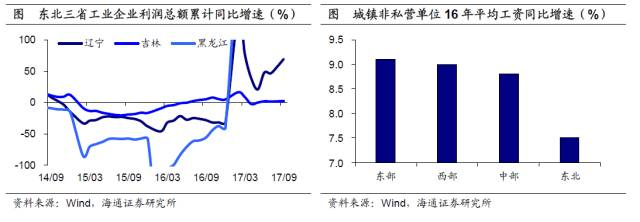 东北地区消费增速滑落主要由于企业盈利下滑导致的工资性收入减少。作为我国的重要工业区,东北地区工业企业利润增速在17年之前已经历长达两年左右的负增长期,如辽宁省从14年11月至16年12月经历长达26个月的工业企业利润总额累计同比负增速。企业盈利下滑造成工资收入下行,东北地区工业经济以国有企业为主,而16年东北地区城镇非私营单位平均工资同比增速7.5%,同期东中西部三个地区平均工资增速均在8.5%以上,差距明显。工资收入下行带动东北地区消费增速整体下滑。