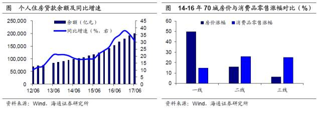 三四线城市消费增速走势分化与房价上涨带来的财产性收入增加有关。自15年4月全国商品房销售面积同比增速由负转正,一直到17年8月这两年多时间以来,全国商品房销售面积同比增速多在两位数以上。房市销售火爆自然推动房价大幅走高,从70城新建商品住宅价格指数同比增速来看,一二三线城市轮番上涨。受益于地产去库存和棚改货币化安置政策,三线城市房价增速在一二线城市有所回调时依然坚挺。