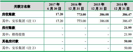 此外,2014年至2017年1-6月来自安乐集团的应收账款分别为386.47万元、386.08万元、773.00万元、17.20万元。