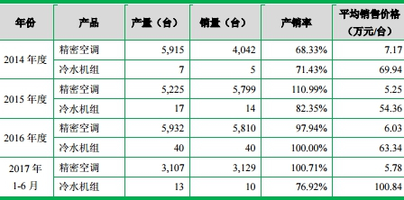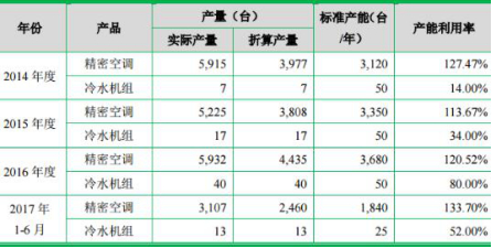 据环球网报道,佳力图的冷水机组产品毛利在2017年上半年大幅提升,但是此项产品的产能利用水平却并不高。根据招股书披露,该公司的冷水机组标准产能为50台/年,而在2017年上半年的折算产量只有13台,对应产能利用率只有52%,相比2016年80%的产能利用水平明显下滑,这意味着该公司的冷水机组产品产能,在2017年上半年有近半数处于被闲置状态。
