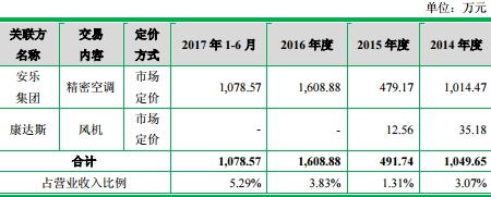 2014至2017年1-6月安乐集团向佳力图采购精密空调,采购金额分别为1,014.47万元、479.17万元、1,608.88万元、1,078.57万元。