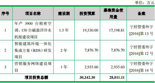 1.年产3900台精密空调、150台磁悬浮冷水机组建设项目,投资预算19,530.00万元,募集资金使用量17,198.81万元;2.智能建筑环境一体化集成方案(RDS)研发项目,投资预算7,876.70万元,募集资金使用量7,876.70万元;3.营销服务网络建设项目,投资预算2,935.60万元,募集资金使用量2,935.60万元。