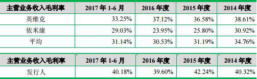 同行业可比公司分别为英维克、依米康。英维克2014年至2017年1-6月毛利率分别为38.61%、36.58%、37.12%、33.25%;依米康同期毛利率分别为30.92%、25.80%、23.95%、29.03%。