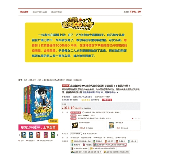 千龙网北京11月24日讯 据北京青年报报道,有网友昨天发布消息称,《皮皮鲁送你100条命》在当当网上的销售页面宣传语中,存在事实错误并涉嫌利用“7·21北京特大暴雨”中的遇难事件进行推广。有关记者在当当网相关页面中看到,这套书的宣传页面中确有“北京特大暴雨、母女从车里游了出来、前面车里的男人却一直在车里,被水淹没遇难了”等文字。