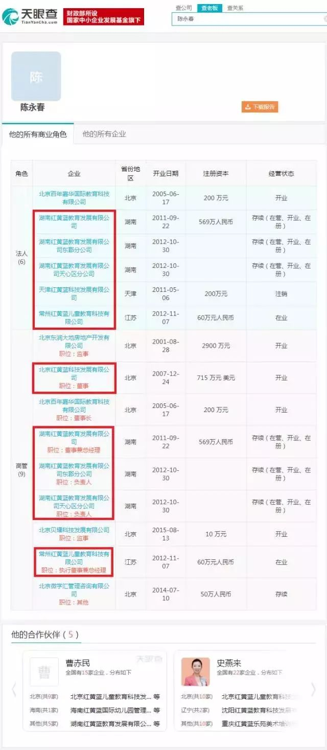来自天眼查的资料显示,北京红黄蓝科技发展有限公司(下称“北京红黄蓝”),位于北京市丰台区科学城航丰路8号,于2007年注册成立,注册资本715万美元,公司董事长为曹赤民,其他高管包括胡文、张慧洁、邓燕玲、史燕来、陈永春、孙闻宇等。