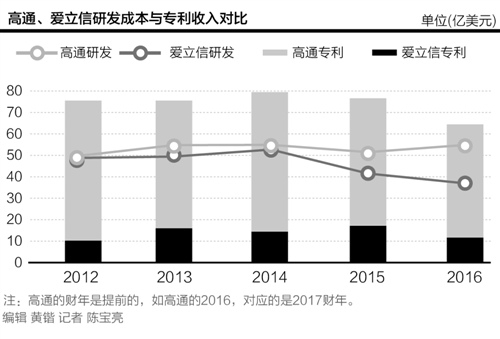 同时,高通的多个专利要素优于爱立信,但该差距远赶不上收入差距。爱立信2016年专利收入11.7亿美元,高通2017财年专利收入64.45亿美元,是爱立信的5.5倍。但同期,爱立信的研发支出远高于高通。2001-2016年,爱立信总计支出研发经费671亿美元,同期高通2002财年-2017财年研发总额为468亿美元。