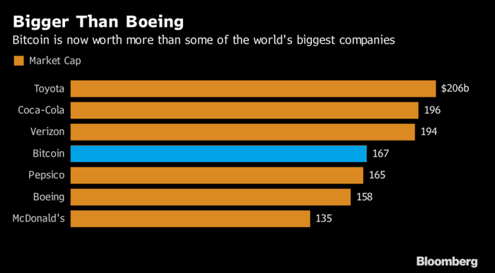 今年以来比特币走势强劲,年度涨幅近11倍,正迈向1万美元大关。据彭博报道,以现有市值计算,1670亿美元的比特币已经超越了标普500指数中95%的成分股,其中就包括百事可乐、波音和麦当劳。