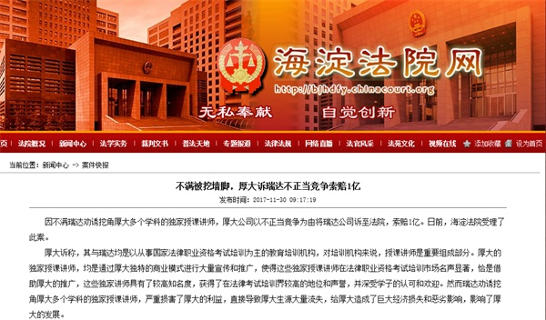 千龙网北京11月30日讯 据海淀法院网消息,因不满瑞达劝诱挖角厚大多个学科的独家授课讲师,厚大公司以不正当竞争为由将瑞达公司诉至法院,索赔1亿。日前,海淀法院受理了此案。