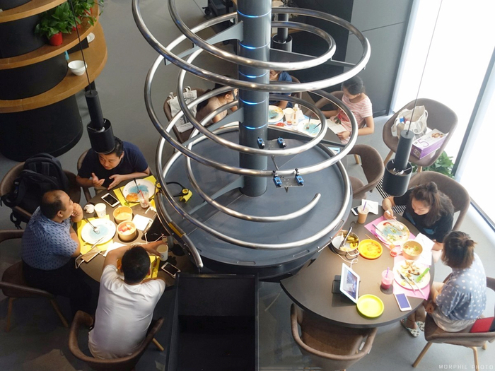 顾客进店后,服务人员会引导他们到相应餐位就坐,餐桌上放置着不同颜色的点餐iPad,顾客可以通过iPad上由客如云定制的菜单自主点餐,并扫码支付。支付成功后,顾客的下单信息会实时同步到厨房显示系统(OnKDS),厨师根据信息出餐,并将餐品递给双螺旋轨道,用失重原理飞速送餐到桌。