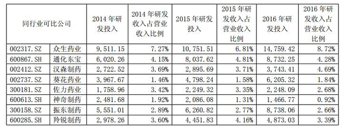 与广告费形成鲜明对比的便是科研费用的投入。在科研费用方面,各家制药公司分给研发的费用都算不上高。据各上市公司2016年年报显示,江中药业在2016年投的研发投入为5410 万元,占公司营业收入的比例为3.46%;葵花药业2016年的研发投入为6205万元,占营业收入的比例约为1.84%。