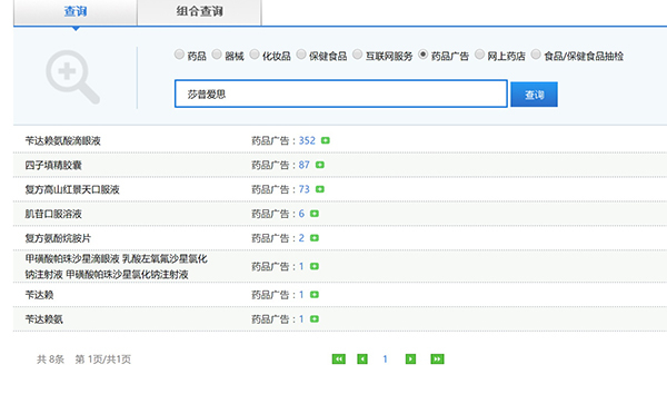 12月4日,澎湃新闻(www.thepaper.cn)查询发现,浙江莎普爱思药业产品苄达赖氨酸滴眼液在国家食药监总局官网上的备案广告多达352条。