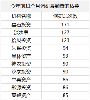 好买统计,今年前11个月,调研次数最多的前五的私募为星石、淡水泉、拾贝、朱雀、景林。