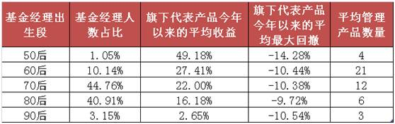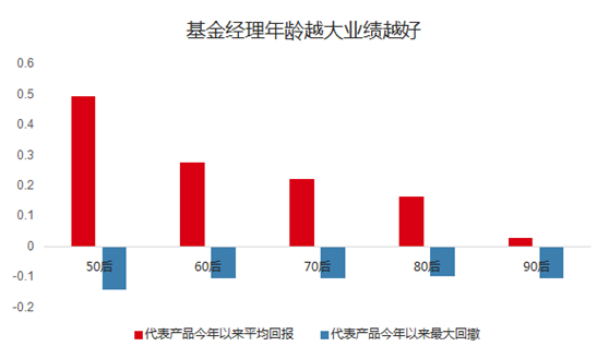 而从投资回报来看,年龄越大的基金经理今年平均业绩越好。50后的代表产品平均业绩高达49.18%;而90后表现最差,平均为2.65%。