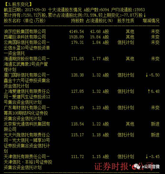 让关注点拉回到北京紫光通信,证券时报·e公司记者进一步统计2017三季报发现,该公司已晋升通葡股份(600365)、*ST紫学(000526)、德豪润达(002005)、浪莎股份、西部证券(002673)、欣龙控股(000955)、华银电力(600744)、星湖科技(600866)、国农科技(000004)、*ST平能(000780)、祥龙电业(600769)、英力特(000635)、众信旅游(002707)、紫光股份(000938)、精艺股份(002295)、文一科技(600520)等16只个股前十大流通股东。