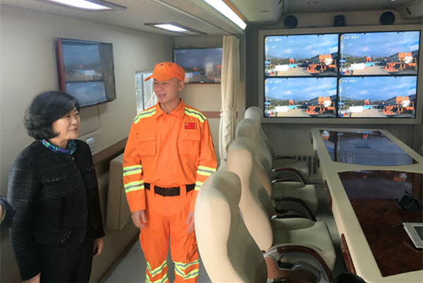 文舟(图右)向国家安全生产应急救援指挥中心副巡视员华梅一行介绍应急平台终端+移动营房车。