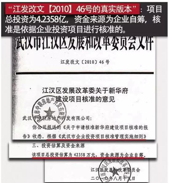 刘书庆特别提醒说:“值得一提的是,‘江发改文【2010】46号’项目核准文件的批准时间是2010年8月19日,而武汉中联公司提交区发改委的《关于新华府申请核准的报告》的时间却是2010年8月20日,即申请核准的时间居然迟于核准文件作出的时间,时间颠倒,悖于常识。该份申请显示,项目的总投资估算为61675万元,资金来源为企业自筹31675万元,银行贷款30000万元,该内容与‘江发改文【2010】46号骗贷版本’吻合,系配套使用。”