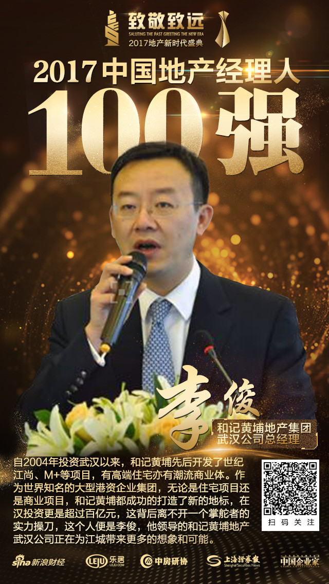 2017年12月12日,由新浪财经、乐居、中房研协、上海证券报和中国企业家联合主办的“2017中国地产经理人”评选结果在北京揭晓。和记黄埔地产集团武汉公司总经理李俊正式当选“2017中国地产经理人100强”。