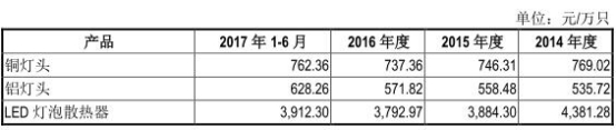 2013年-2017年1-6月,灯头类产品收入占主营业务收入的比例分别为99.70%、93.88%、63.85%、50.27%、42.13%,是公司收入的主要来源。从主要产品价格来看, 2014年-2017年1-6月,公司主要产品铜灯头平均单位售价分别为769.02元/万只、746.31元/万只、737.36元/万只、762.36元/万只。铝灯头平均单位售价分别为535.72元/万只、558.48元/万只、571.82元/万只、628.26元/万只。LED 灯泡散热器平均单位售价分别为4,381.28元/万只、3,884.30元/万只、3,792.97元/万只、3,912.30元/万只。公司称,2014 年至 2016 年,铜灯头平均单位售价呈下降趋势,主要系铜带等原材料价格下降传导至销售市场,导致铜灯头产品售价有所下降。