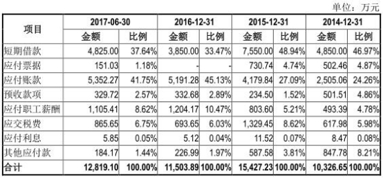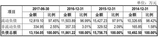 招股书显示,2013年-2017年1-6月,负债总额分别为0.92亿元、1.05亿元、1.58亿元、1.19亿元、1.32亿元。流动负债总额分别为0.91亿元、1.03亿元、1.54亿元、1.15亿元、1.28亿元。资产负债率(合并)分别为38.02%、37.21%、38.83%、25.82%、25.57%。