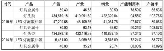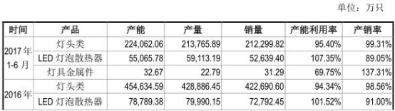 2013年-2017年1-6月,公司灯头类产能利用率分别为95.50%、97.34%、94.55%、94.34%、95.40%。2014年-2017年1-6月,LED 灯泡散热器产能利用率分别为72.24%、97.67%、101.52%、107.35%。灯具金属件产能利用率分别为88.03%、90.25%、78.59%、69.75%。