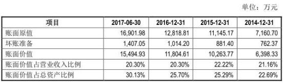 招股书显示,2013年-2017年1-6月,公司应收账款账面价值分别为4,957.45万元、6,398.33 万元、10,263.77万元、11,804.61万元、15,494.93万元,占流动资产的比例分别为32.31%、36.63%、36.89%、39.51%、45.50%,占营业收入的比例分别为18.23%、21.16%、22.22%、20.30%、20.30%。应收账款周转率(次)5.70、5.33、5.55、5.27、5.59。