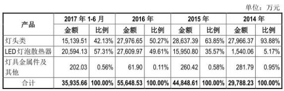 招股书显示,2013年-2017年1-6月,灯头类产品收入占主营业务收入的比例分别为99.70%、93.88%、63.85%、50.27%、42.13%,是公司收入的主要来源。2014 年至 2017 年 1-6 月,灯头类产品收入金额较为稳定,但由于 LED 灯泡散热器收入的迅速增长,灯头类产品收入占比下降。